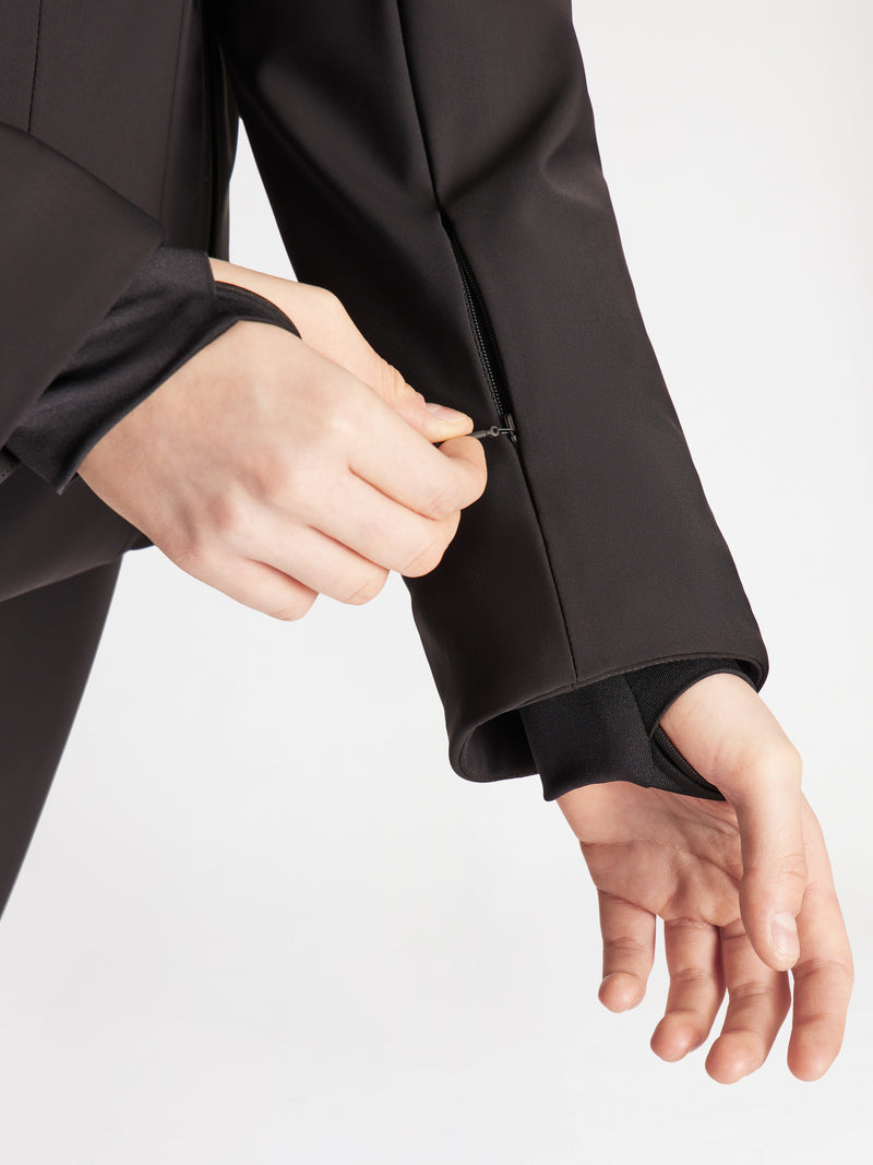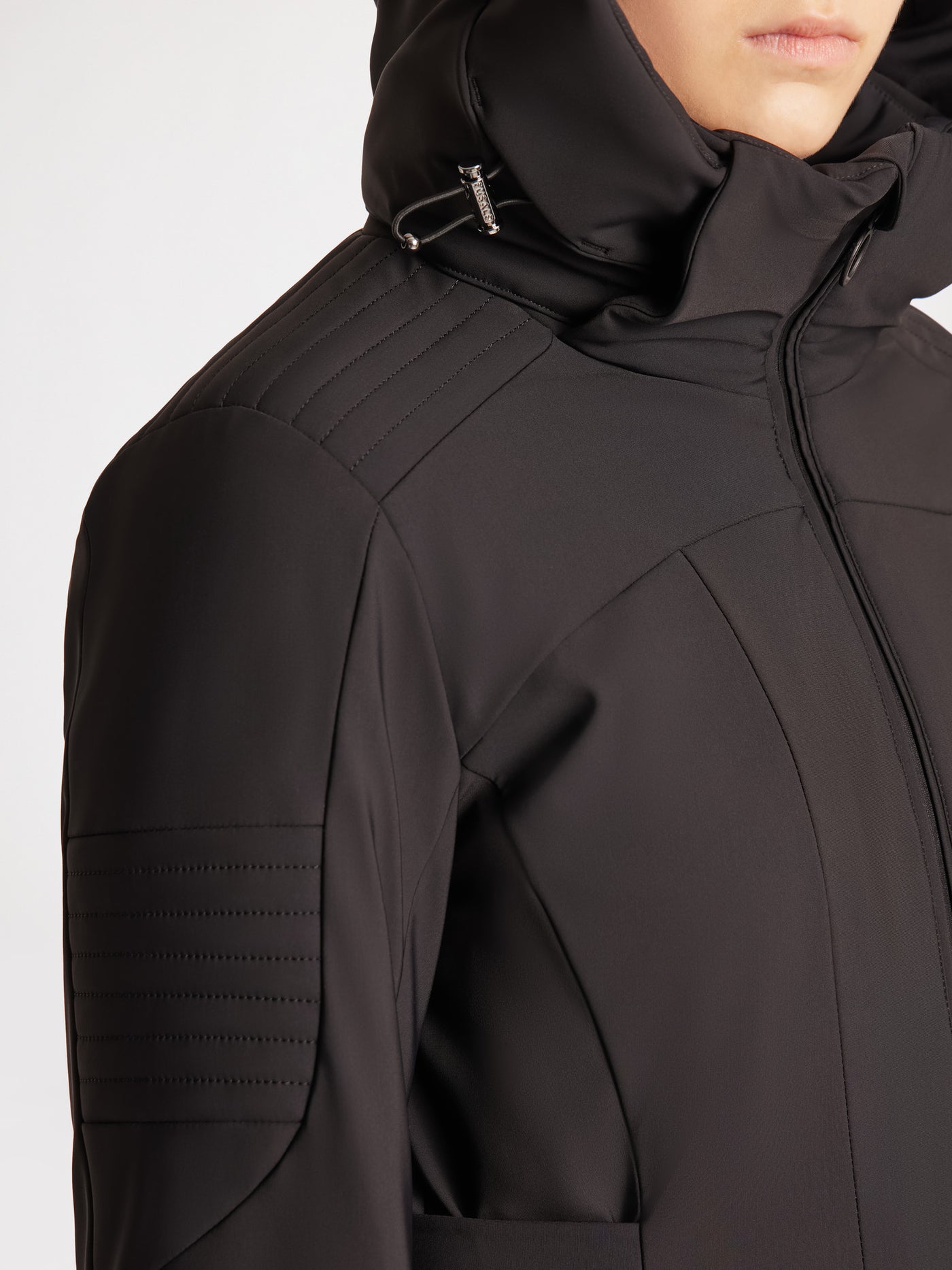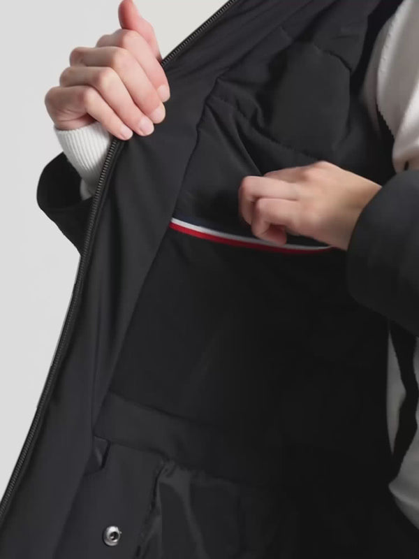 The Katarina ski jacket combines technical features with functionality and a sophisticated look. Made of waterproof, water-repellent softshell, it is perfect for extremely cold weather. Designed for skiing, it reaches below the buttocks and features an adjustable waist with tabs for optimal warmth and a resolutely feminine look. Equipped with indispensable details such as a snow guard with anti-slip elastic, multiple pockets, waterproof zippers, and a removable adjustable hood, this jacket is an essential part of the Fusalp woman's ski wardrobe. Pair it with the Diana, Tipi III, or Valentina fuseau ski pants for an iconic Fusalp look.