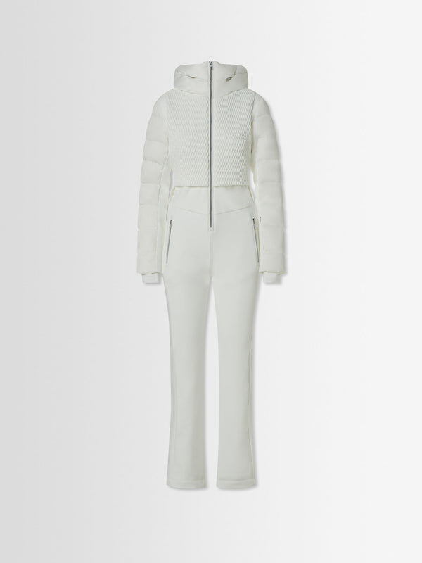 The Marie ski suit dazzles with its glamorous and sophisticated silhouette. It is made of windproof, waterproof, and water-repellent satin fabric with extremely warm down padding. This dual-material ski suit is designed with stretchy, windproof softshell pants with a fleece lining and an iconic smock diamond on the chest. An adjustable belt highlights the waist and completes the elegant look. Perfectly combining technical savoir-faire and traditional tailoring expertise, Marie is reminiscent of Fusalp's first technical ski suit, which has since become a modern icon of the brand.