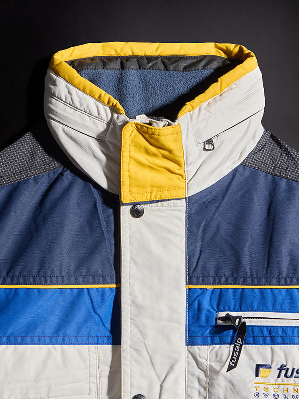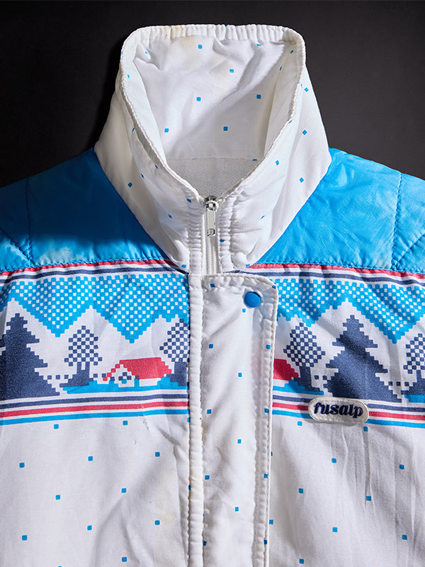 Cet anorak Fusalp, aux teintes vives de bleu, blanc et jaune, évoque l'énergie exaltante de la montagne. Il symbolise non seulement la protection contre le froid hivernal, mais aussi la chaleur intemporelle des liens familiaux tissés sur les pentes enneigées.