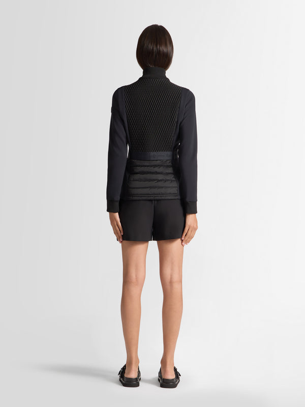 La veste légère Meryl séduit par son allure iconique. Confectionnée en Powerstretch nylon satiné déperlant, associé à une matière effet néoprène technique Fusalp, elle se pare du smock diamant, signature de la marque tandis que sa taille est soulignée par un élastique monogrammé Fusalp pour un contraste tout en féminité. La veste rehaussera toutes vos tenues et se porte aisément seule à l’intersaison ou en layering sous un manteau. Elle signe une esthétique glamour et versatile.
